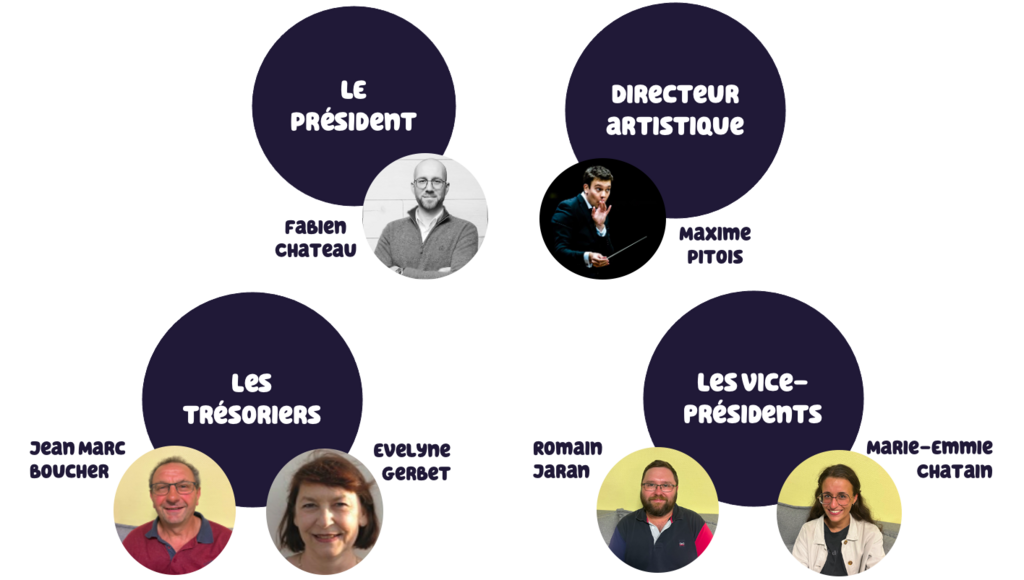 Le conseil d'administration (CA) de la musique est composé d'un bureau et de membres qui se réunissent tous les mois pour animer la vie associative, organiser les concerts et prendre des décisions en rapport avec l'association de la musique municipale de Chenôve.